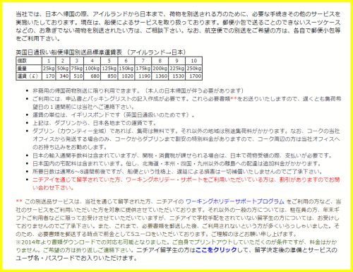 かつては多くの留学生の方にご利用いただいた、船便による帰国荷物別送サービスですが、コロナ禍を経てウクライナ紛争が起こり、輸送費の高騰その他様々な事情により、現在は実質、利用がかなり難しくなっています。できないことはありませんが、英国日通さんの方でも標準料金表を出さなくなり、毎回その時の輸送費に基づき個別見積もりをお願いする形になりました。その費用も、2022年時点で見積もりを依頼した際に、アイルランド発郵便小包の倍近い値段になりました。